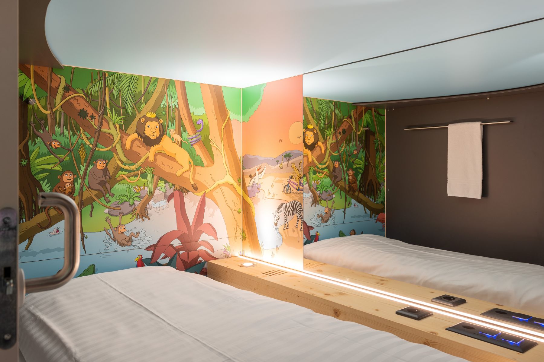 Das Familienzimmer mit zwei Schlafkapseln für die Kinder und zwei Schlafplätzen für die Grossen inkl. Spielecke