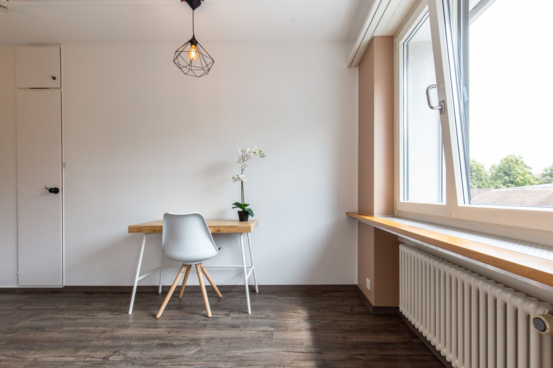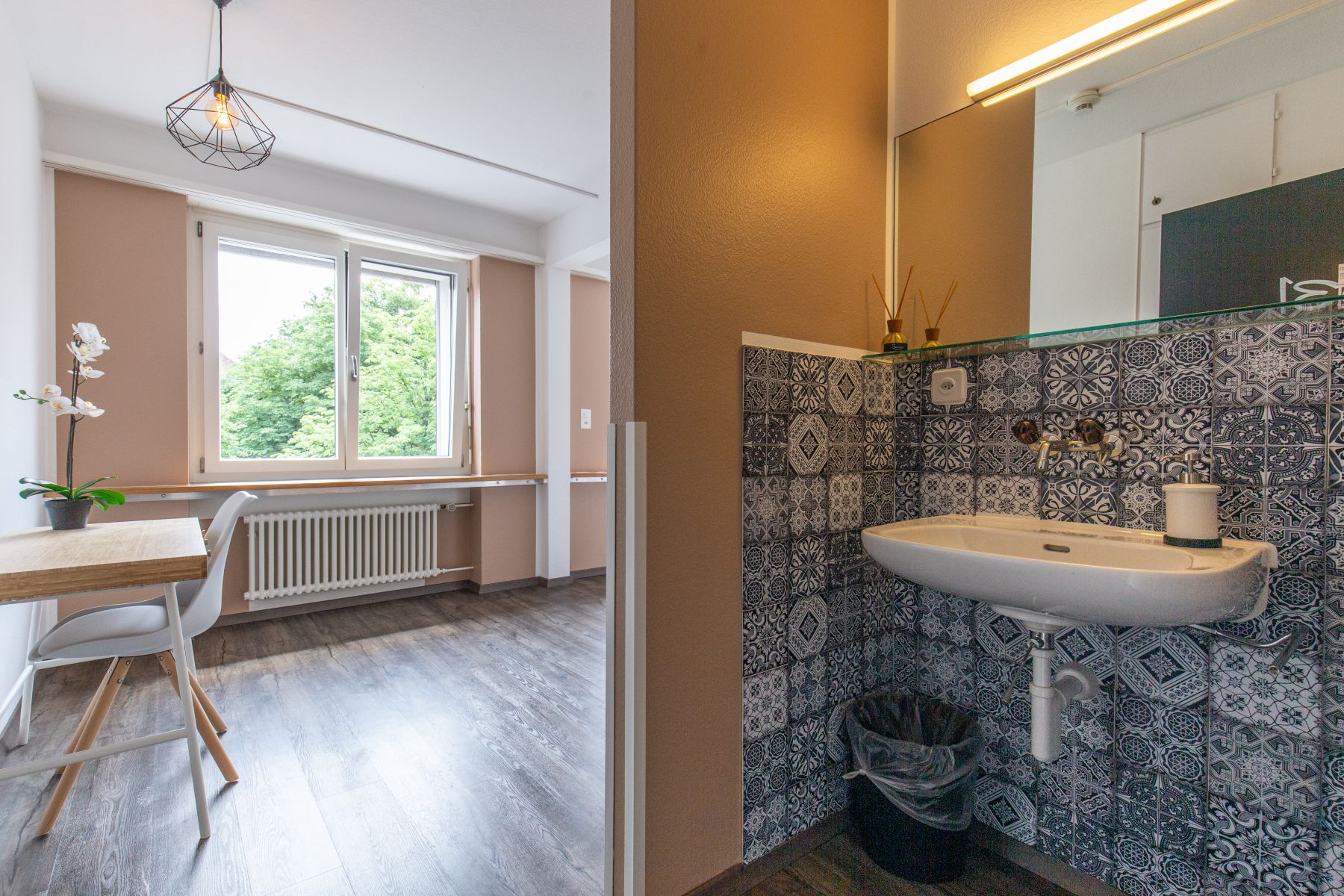 The 25sqm room is equipped with a bed, bedside table, wardrobe, desk, chair, lighting and curtains, as well as its own washbasin in the room. Bathrooms are on every floor with shower and toilet, utilities included, daily cleaning of the sanitary facilities plus weekly room cleaning included.
