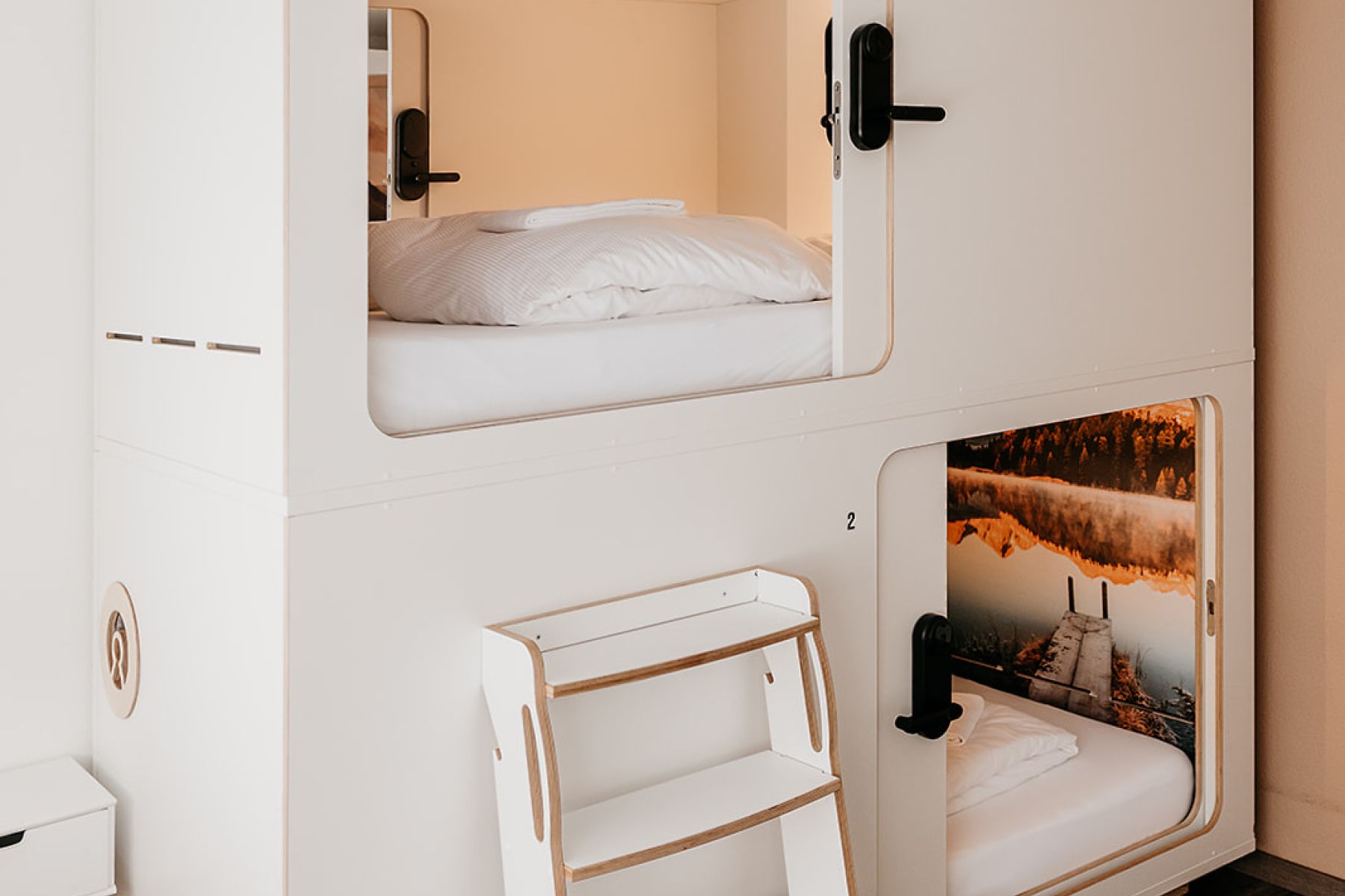 The capsule dormitory offers a cost-effective way to rest in a private, comfortable capsule bed, providing you with your own cozy retreat. Showers and WCs are conveniently located in the corridor. At Hyve, you’ll enjoy a unique blend of privacy and the opportunity to connect with fellow guests and our vibrant community. Your accommodation : The linked bathroom is the same as the dorm beds