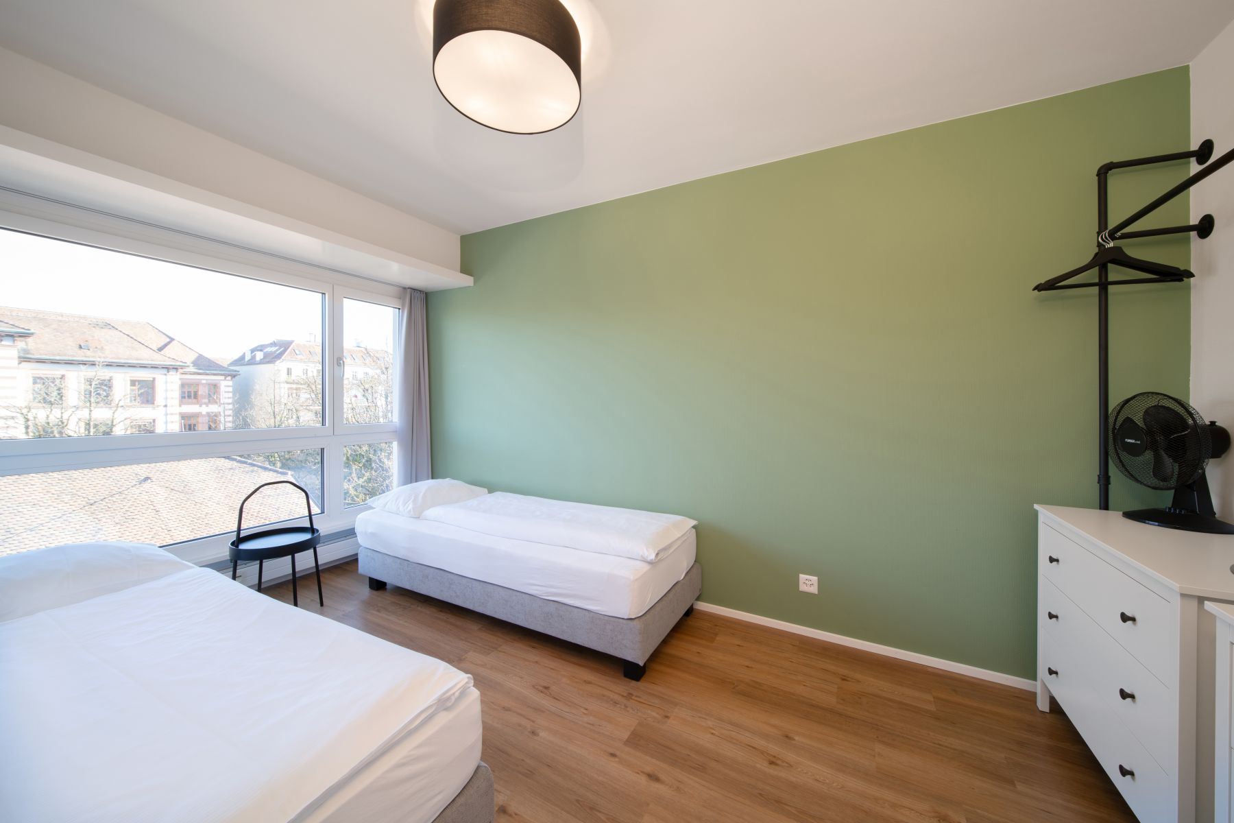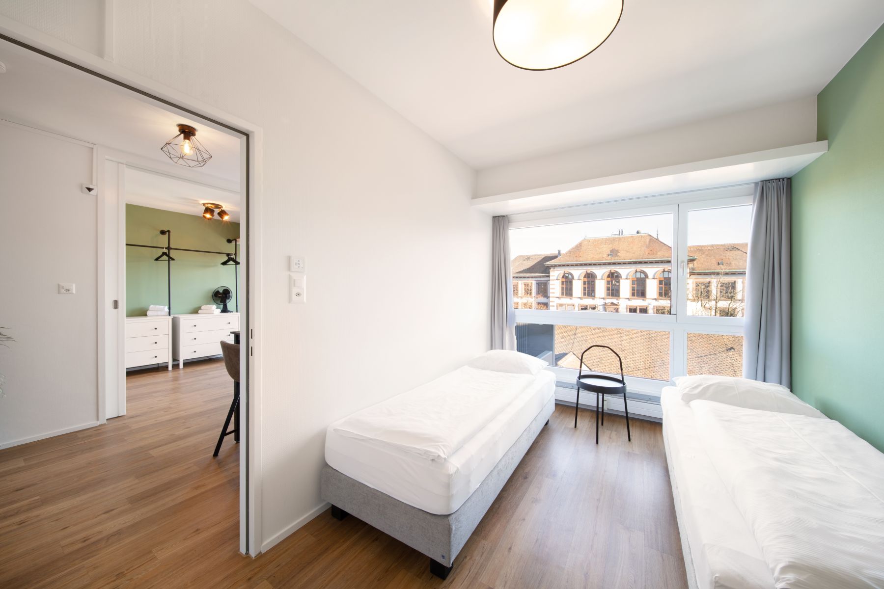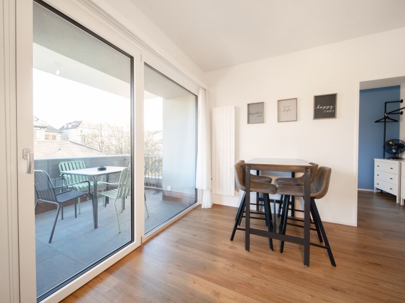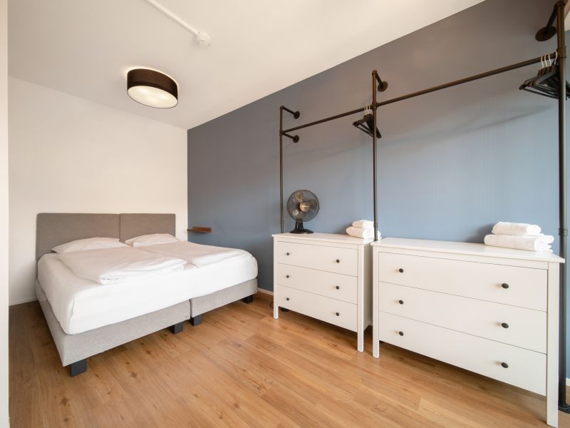 Our 52sqm studio is equipped with two single beds and one double bed, bedside tables, cupboard with fridge, dining room with four bar stools and table and bathroom with toilet and shower. On the beautiful balcony you have a great view. Service charges included, weekly room cleaning included.